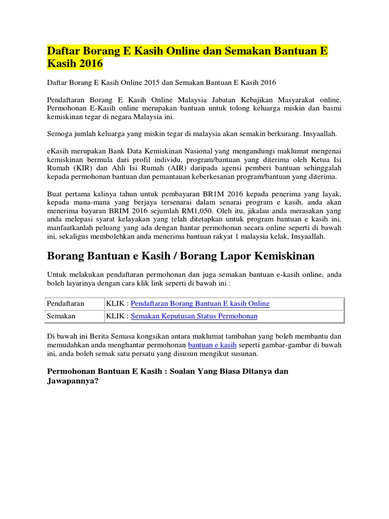 Teruskan membaca untuk prosedur. Antara ciri-ciri utama yang terdapat dalam eKasih adalah seperti berikut. Permohonan bantuan secara atas talian online adalah ditangguhkan atas sebab masalah teknikal yang tidak.
